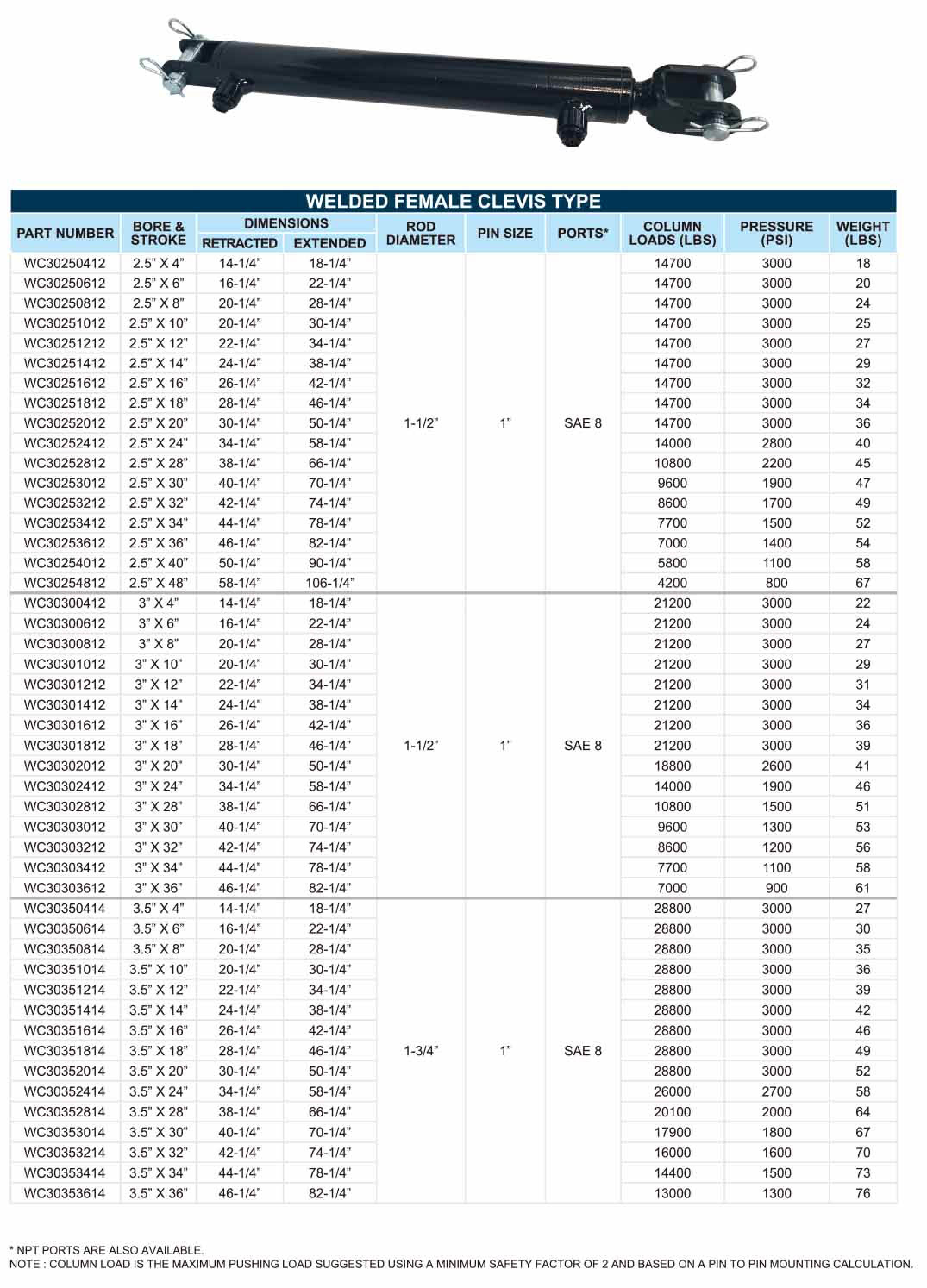 WC-3000PSI Welded Clevis Type Hydraulic CylinderProduct DescriptionEVER-POWER Hydraulic offers precision industrial quality in a standard clevis mounted Welded Clevis Cylinder (Welded Cylinders) , and exceeds the highest standards. These Cylinders are Available at 2500 psi and 3000 psi, pressure ran......